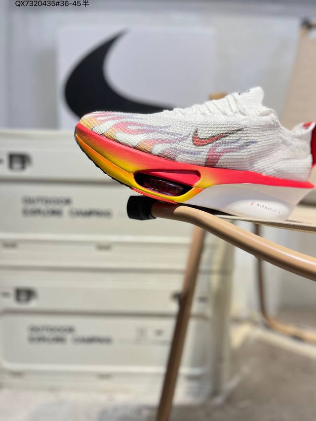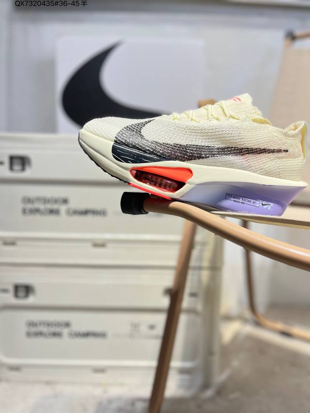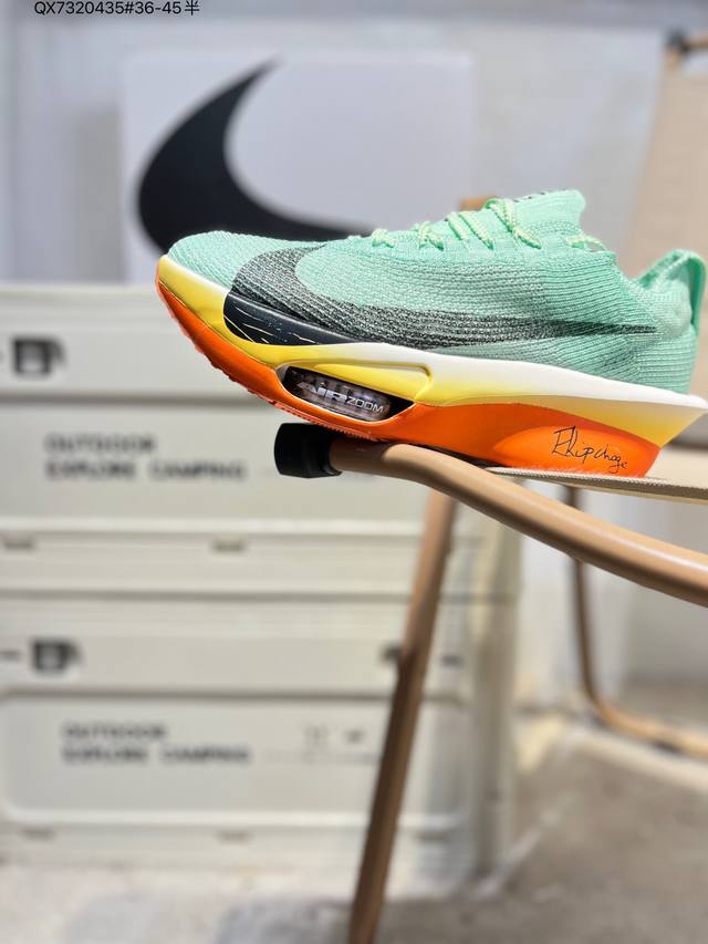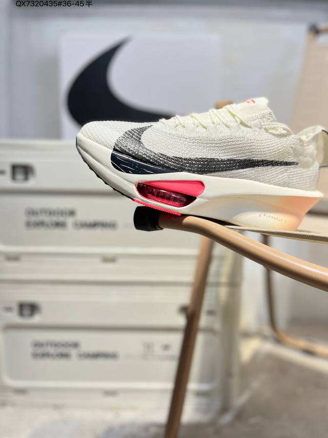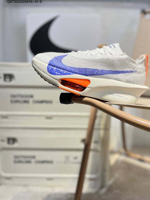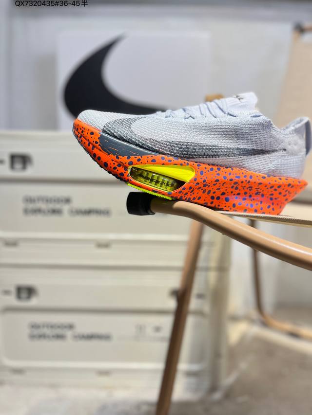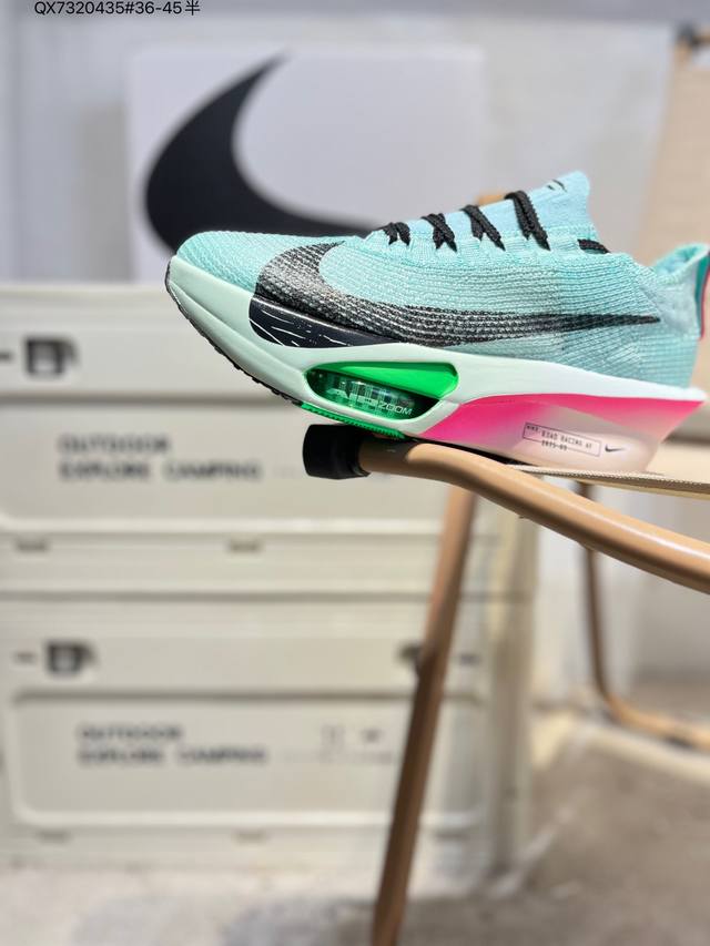 Nike Air Zoom Alphafly Next% 3 Marathon: The newest marathon super running shoe. The lightest and most tested Nike Alphafly ever, tested and validated by elite marathon runners and featuring Air Zoom cushioning, designed to help runners achieve breakthroughs and better results. During its development, Alphafly 3 helped Nike athlete Kelvin Kiptum break the marathon world record with a time of 0:35. The Alphafly's dynamic design remains unchanged, retaining the Air Zoom cushioning unit, Flyplate carbon fiber plate, and Zoomx foam. However, the overall system's construction method has been slightly adjusted, optimized, and improved to enhance its support for athletes. Key updates include a one-piece sole providing a smooth and stable "heel-to-toe" transition; a wider full-length Flyplate carbon fiber plate providing stable propulsion; a new Fast Shot outsole ensuring excellent traction and grip; and a new Atomknit 3.0 upper providing enhanced control, breathability, and midfoot support. Product Code: Ib4201 Qx7320435#36-45 half