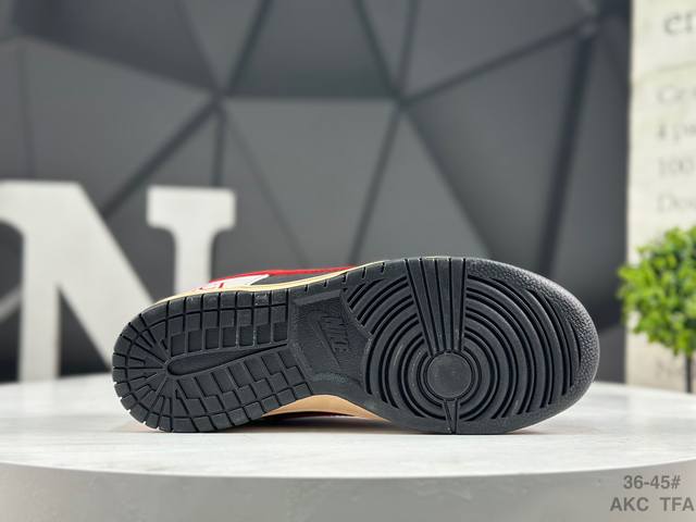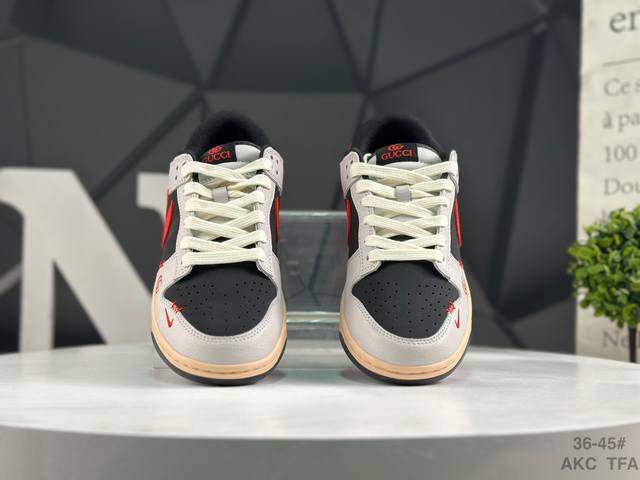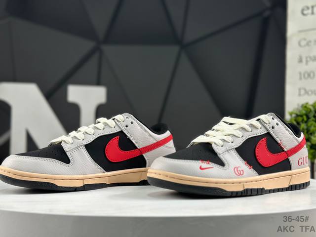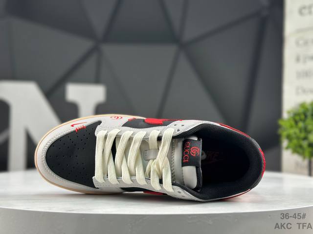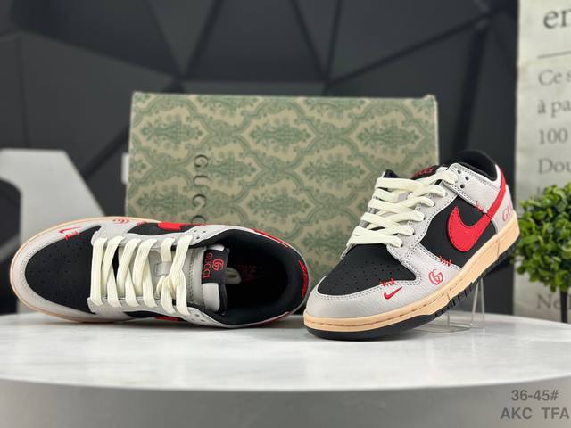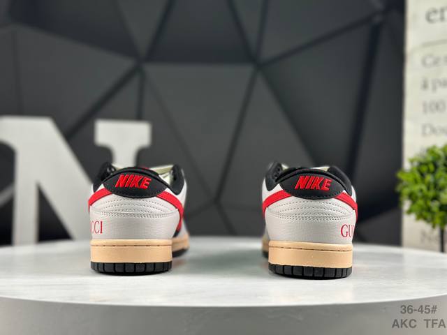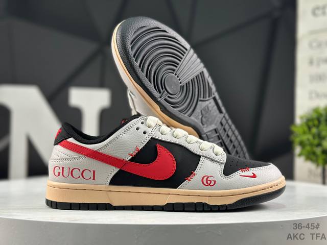 Nike Gucci X Nike Dunk SB Low. This Gucci x Nike SB collaboration low-top casual sneaker features a black suede upper with a beige leather overlay, making it very versatile. The tongue features an embroidered Gucci logo, while the Swoosh logos on both sides are accented in red. The heel counter is black, and the mesh tongue enhances breathability. The Nike lettering on the heel is embroidered in red, and the Nike Swoosh logo and Gg lettering on the side of the toe are also in red. The heel features the Gucci logo, highlighting the collaboration. Finally, an aged, oxidized midsole and a black rubber outsole complete the design.