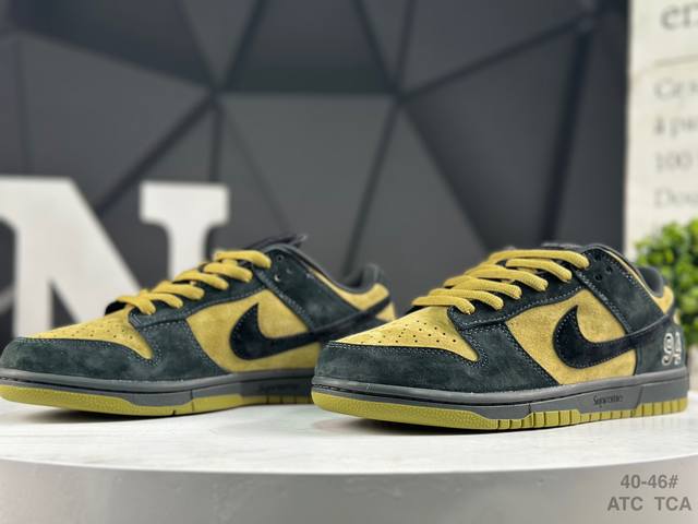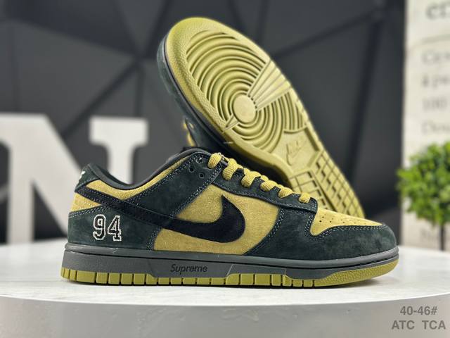 Nike Supreme X Nike Dunk SB Low. This shoe features an embroidered "94" on the heel, commemorating the brand's founding year. The brand's iconic logo is also etched onto the sidewall of the midsole. The insoles retain the standard red surface, with the Nike SB logo on each insole, and the Supreme logo spanning both insoles. Style Code: Hq8487-300 Sizes: 40 40.5 41 42 42.5 43 44 44.5 45 46 Atc Tca