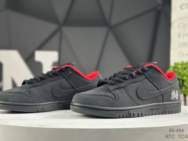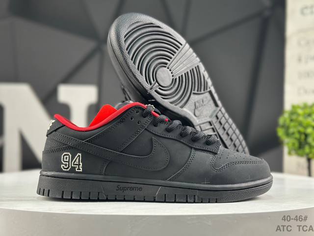 Nike Supreme X Nike Dunk SB Low. This shoe features an embroidered "94" on the heel, commemorating the brand's founding year. The brand's iconic logo is also etched onto the sidewall of the midsole. The insoles retain the standard red surface, with the Nike SB logo on each insole, and the Supreme logo spanning both insoles. Style Code: Hq8487-001 Size: As shown in the picture.