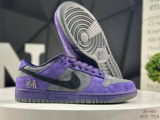Nike Supreme X Nike Dunk SB Low. This shoe features an embroidered "94" on the heel, commemorating the brand's founding year. The brand's iconic logo is also etched onto the sidewall of the midsole. The insoles retain the standard red surface, with the Nike SB logo on each insole, and the Supreme logo spanning both insoles. Style Code: Hq8487-500 Size: As shown in the picture (Atc Tca)