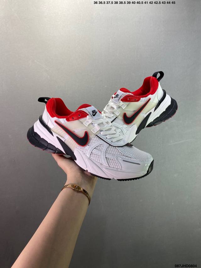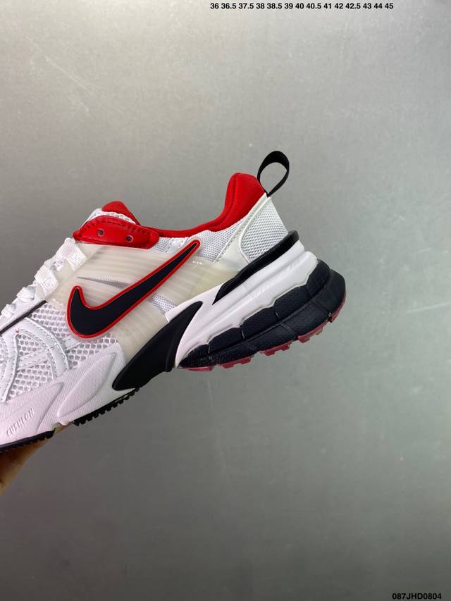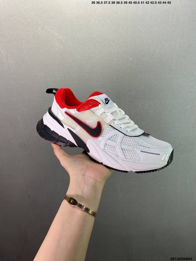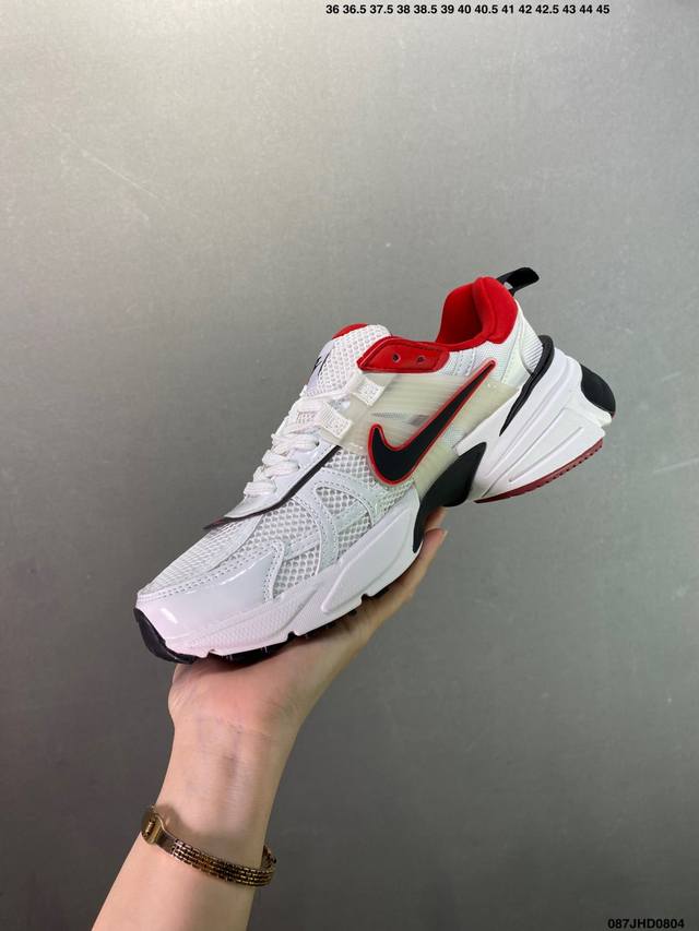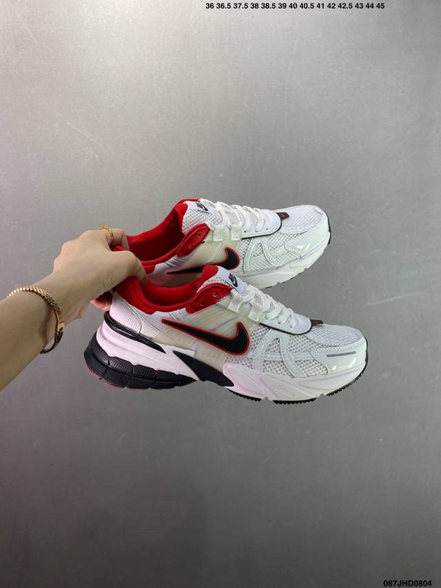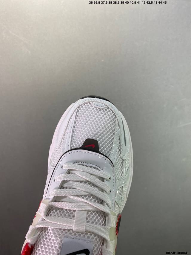 Nike V2K Run running shoes are retro and breathable mesh sneakers in gray and silver. The compact upper material provides good wrapping. The Swoosh on the side of the shoe and the toe part add a lot of highlights with chrome details. The insole is printed with Bill Bowerman's portrait to add details. The midsole is decorated with a unique distressed effect and finally the black outsole highlights the retro temperament of the whole pair of shoes.