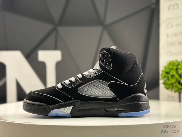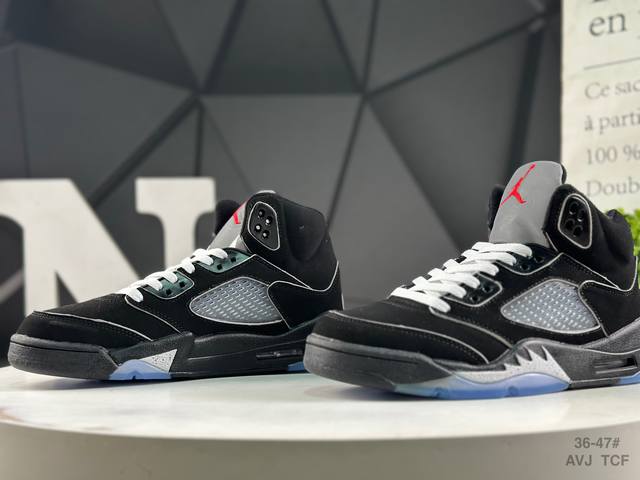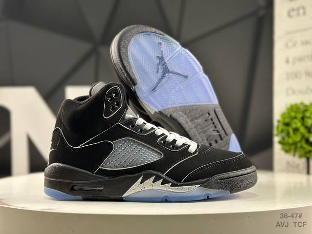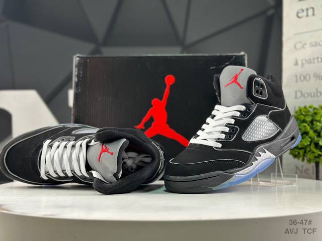 The Nike Air Jordan 5 Retro Black Metallic Reimagined high-top 2025 re-release series features a black suede cover, transparent crystals on the side panels, and silver splashes of ink on the iconic sharktooth design. The tongue retains the signature 3M reflective design and features a red Jumpman logo. The midsole features a transparent, visible Air cushioning unit, while the original Nike Swoosh and Air logo are embroidered in white on the heel, echoing the tongue. 3M reflective accents are added to the upper panels, while the silver sharktooth design on the midsole is striking. The sole is a black midsole with a translucent crystal outsole, finished with a black Jumpman logo beneath.