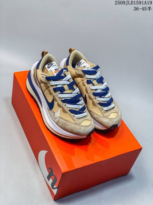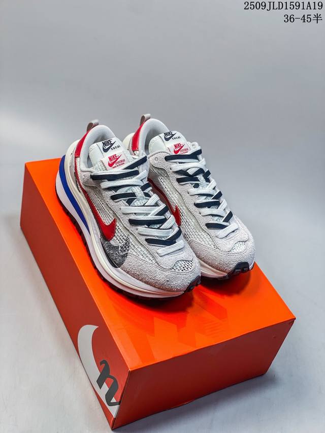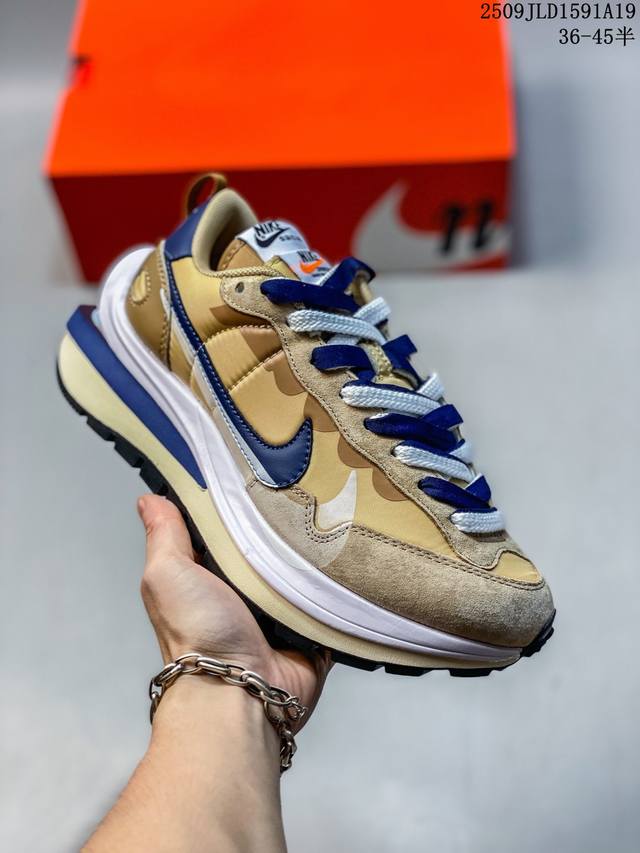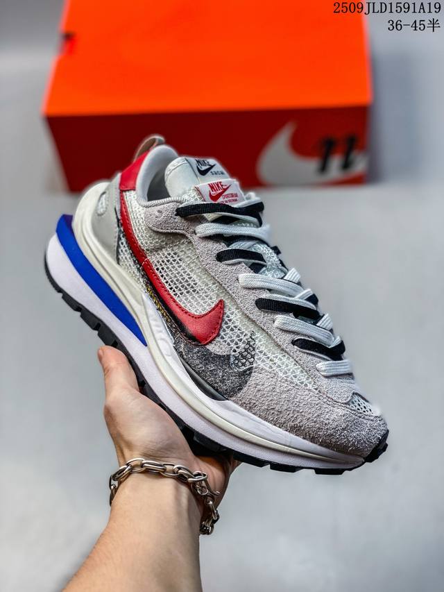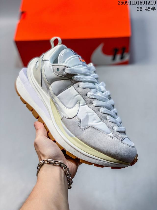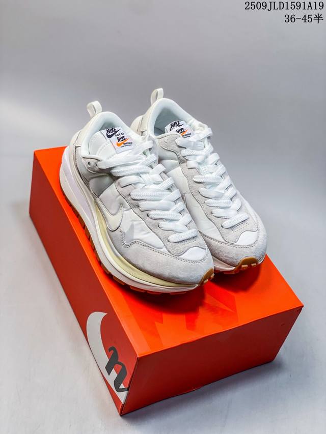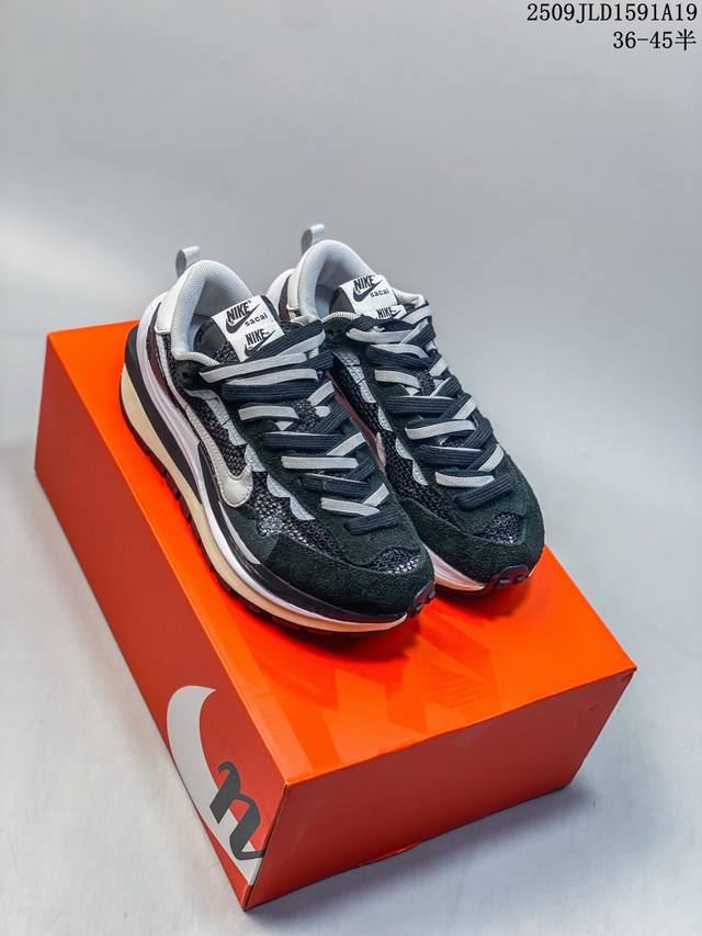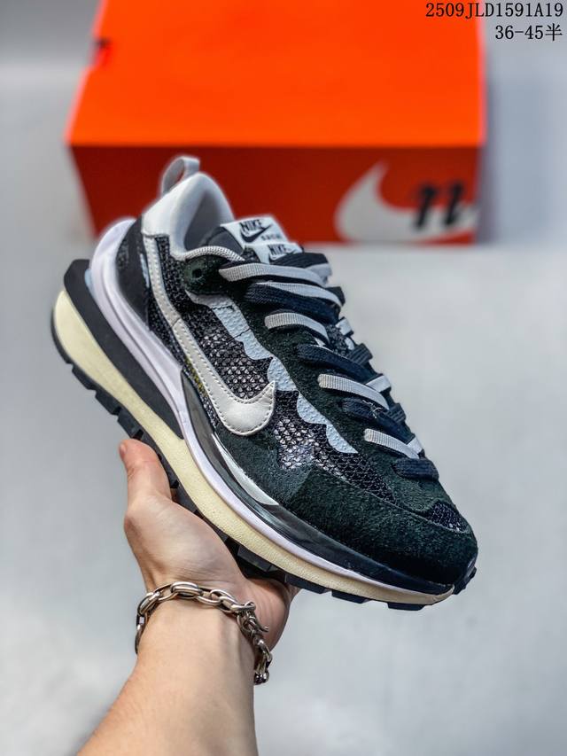 The Nike Sacai x Nike Regasus Vaporrly Sp 3.0 runway shoe is crafted from a combination of suede and breathable mesh. The familiar deconstructed design, overlapping Swoosh, double tongue, laces, and Sacai font on the heel are all retained. The biggest highlight is the extra-layered sole, rivaling Balenciaga's Triples, for a truly height-enhancing effect. Item No.: Cv1363-100