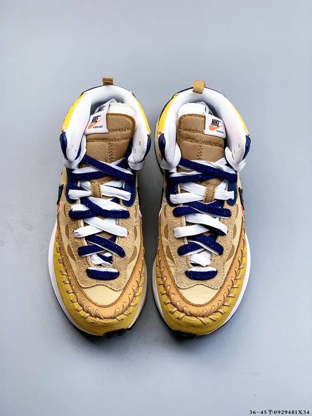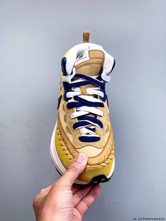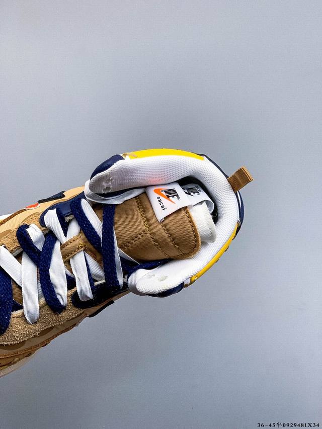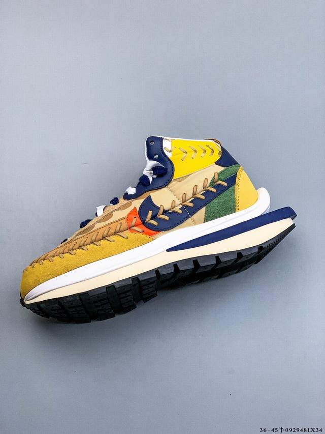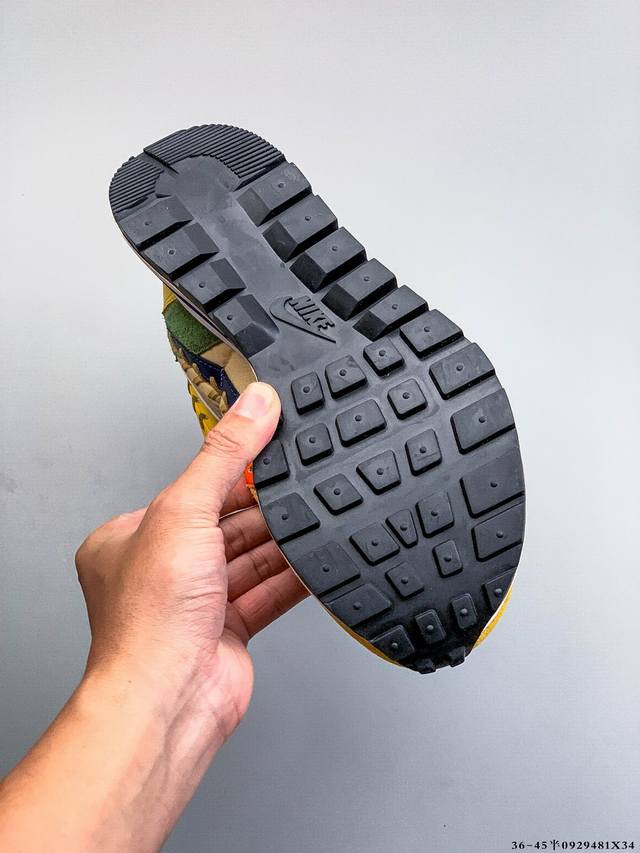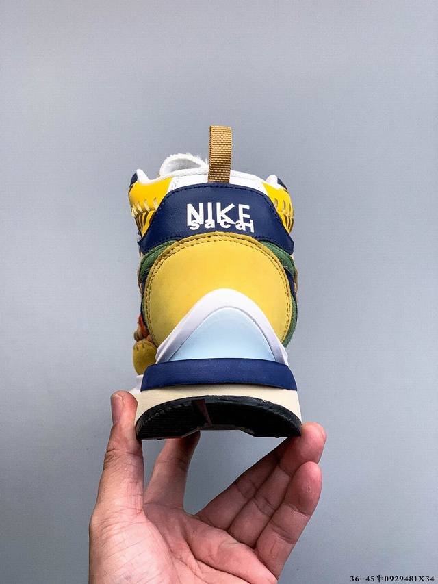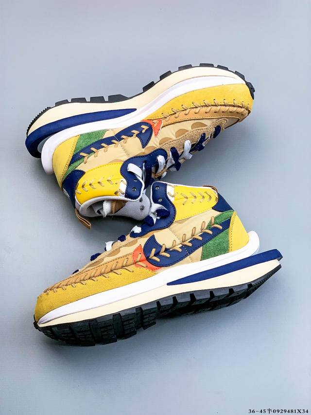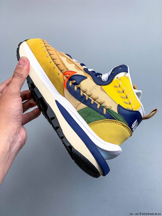 The Sacai x Nike Ldvaporwaffle Mix collaboration features retro, versatile waffle shoes. The two shoes come in a pure black colorway, and a multi-color design with yellow, green, and blue accents. The familiar double-layered Swoosh and tongue label remain. The shoe's distinctive design features prominent seams on the upper and sides. The sole retains the familiar curved hem design. 0929481X34