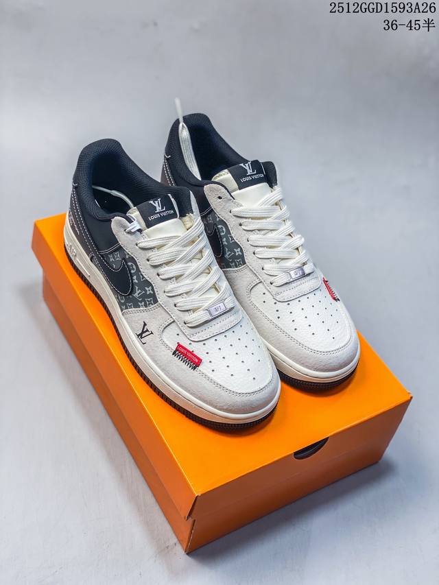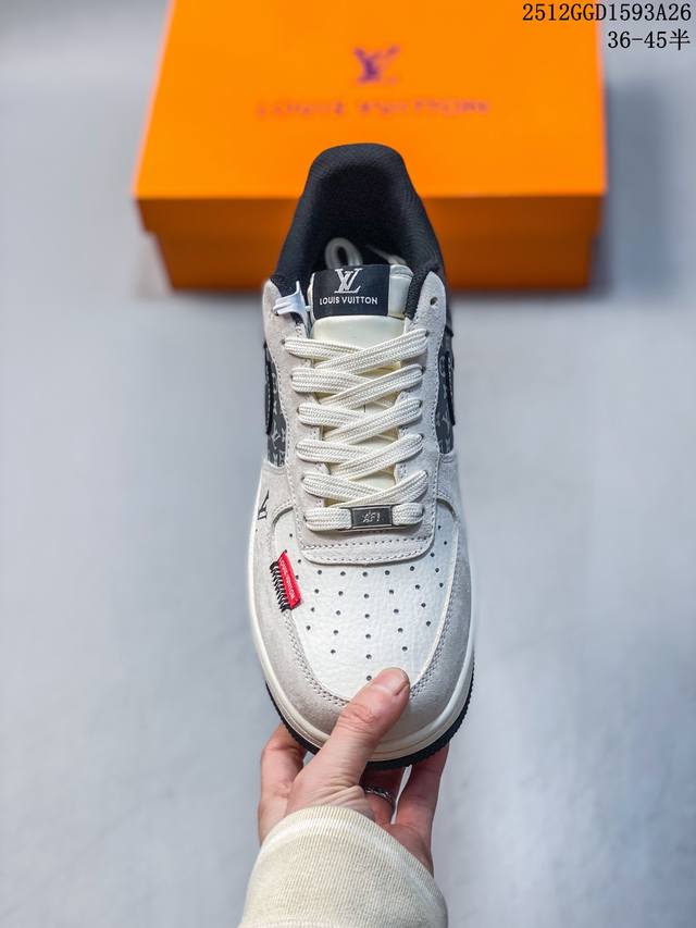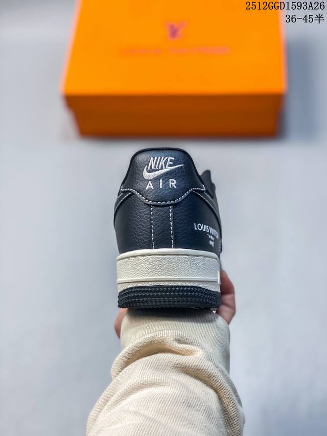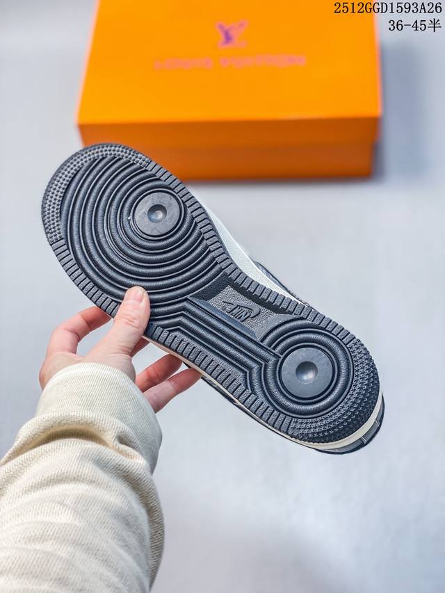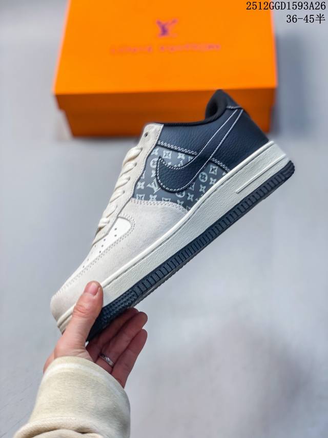 When the classic Af1 meets luxury monogrammed leather, this Nike Air Force 1 Low Kd6699-F08 takes the fusion of luxury and streetwear to the extreme! Navy suede meets off-white monogrammed leather, with a red accent instantly brightening the look. The layered design of the LV logo and Nike Swoosh breaks down the barriers between dimensions while exuding a high-end feel. The delicate material splicing and exquisite lettering prints reveal a unique, bespoke style in every detail. The Air cushioning retains classic comfort, making it a unique and eye-catching piece in any shoe collection, whether for collecting or wearing. This is the pinnacle of luxury streetwear. Sizes: 36 36.5 37.5 38 38.5 39 40 40.5 41 42 42.5 43 44 44.5 45 (Note: The last part, "Ddd 12Ggd1593A26 DDD," appears to be an unrelated product label and has been omitted from the translation.)