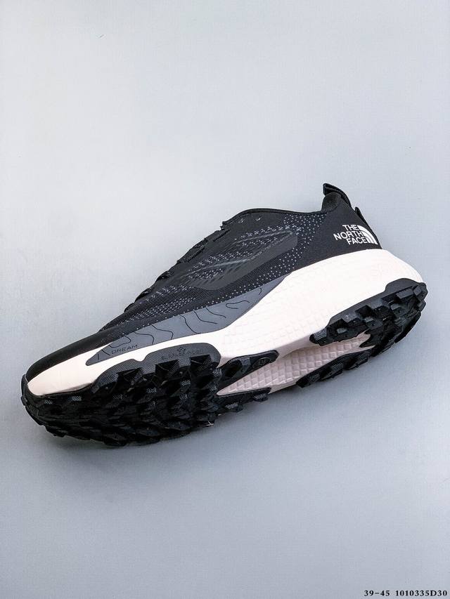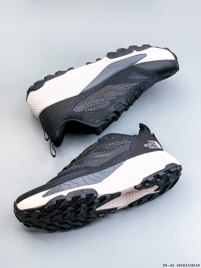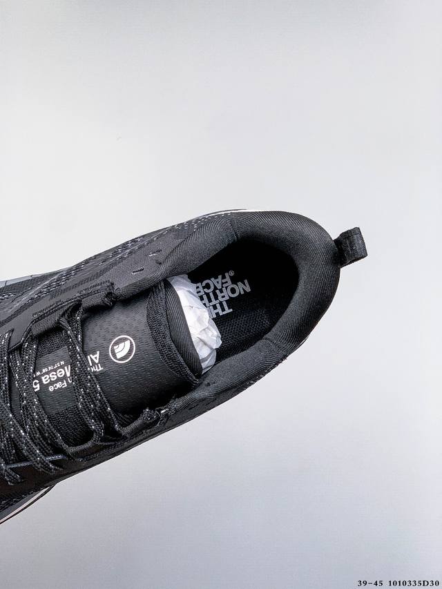 The North Face Altamesa 500 Cushioned Trail Running Shoes, Outdoor Breathable Hiking Shoes. The midsole features The North Face's proprietary Dream supercritical foam material, providing both comfort and stability. The outsole is The North Face's signature Surface Ctrl rubber outsole, with a wider forefoot, midfoot stability, and heel lock-in, coupled with a 4mm lug depth to handle most terrain conditions. The curved rolling sole design, combined with a 6mm heel drop, provides sufficient rolling efficiency and enhances propulsion. The lateral side of the shoe features The North Face logo and the coordinates of Half Dome, the highest peak in Yosemite National Park, decorated with contour lines. (