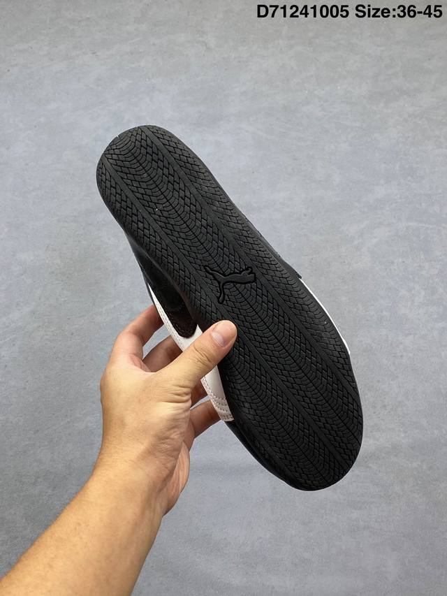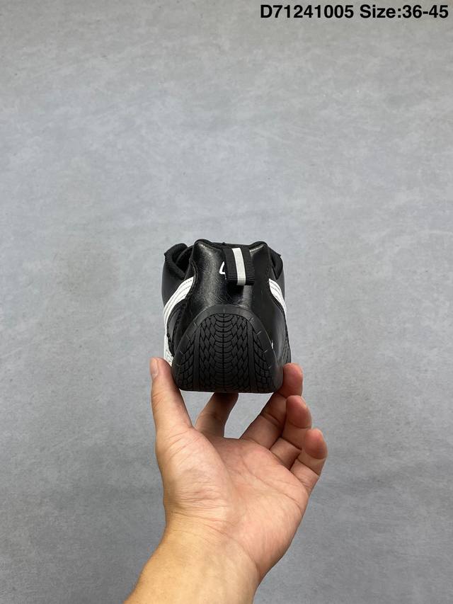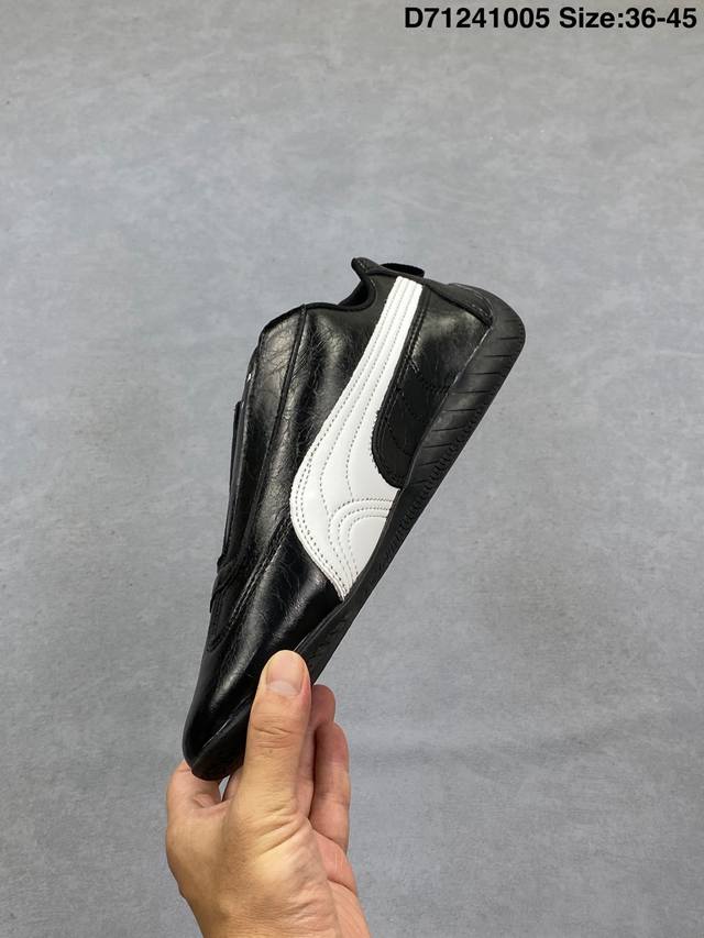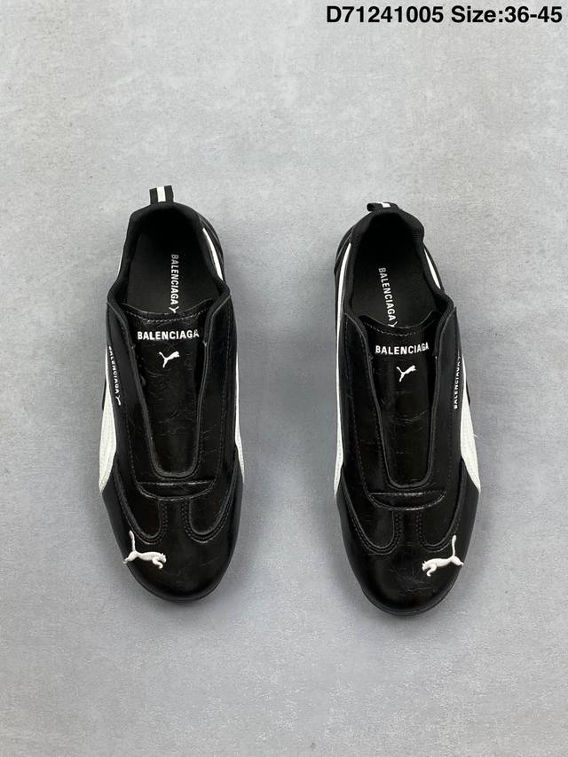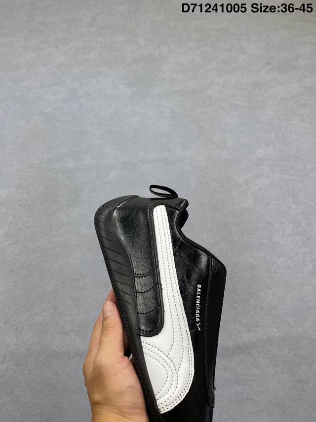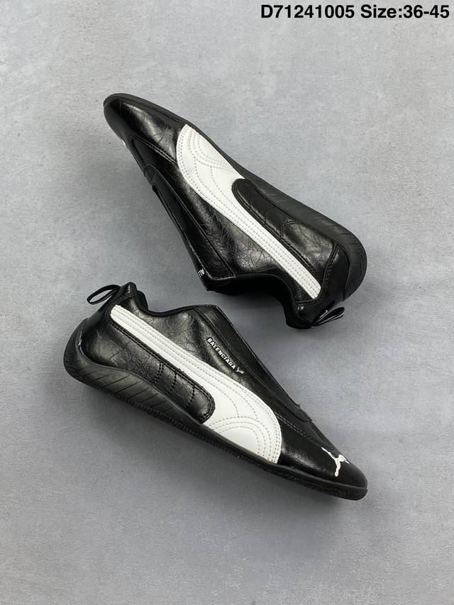 Puma X Balenciaga Speedcat collaboration black and white slim-soled German training shoes, racing shoes, cowhide round toe slip-on low-top casual shoes. This Balenciaga X Puma collaboration uses the highly popular slim-soled Speedcat as its base. The already super-hot racing shoe model has been infused with Balenciaga's soul