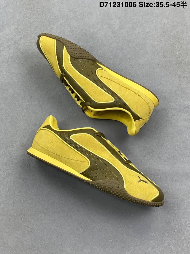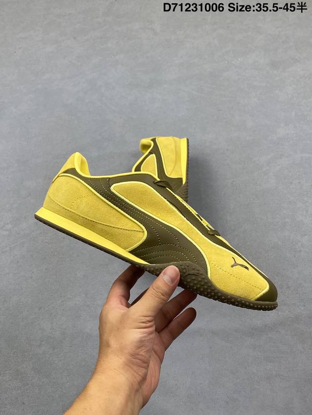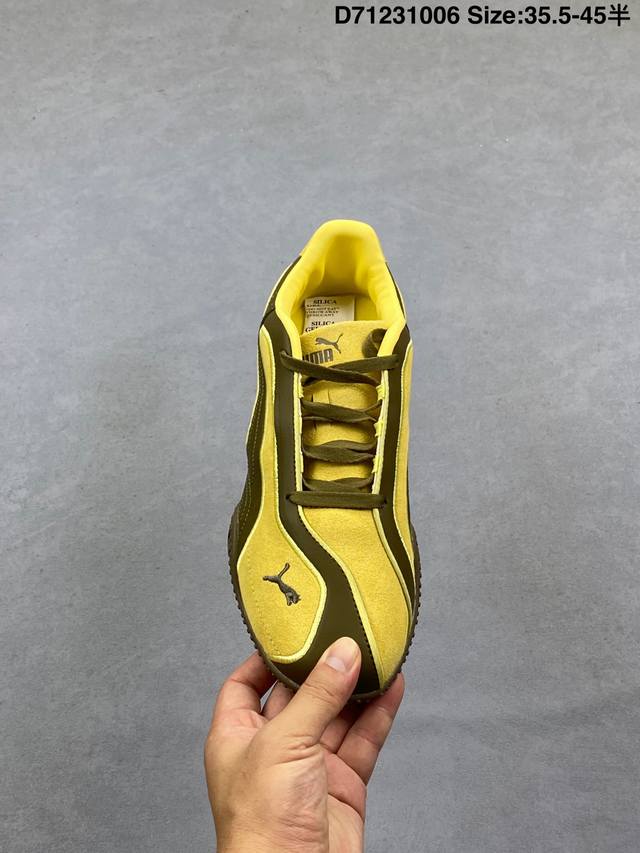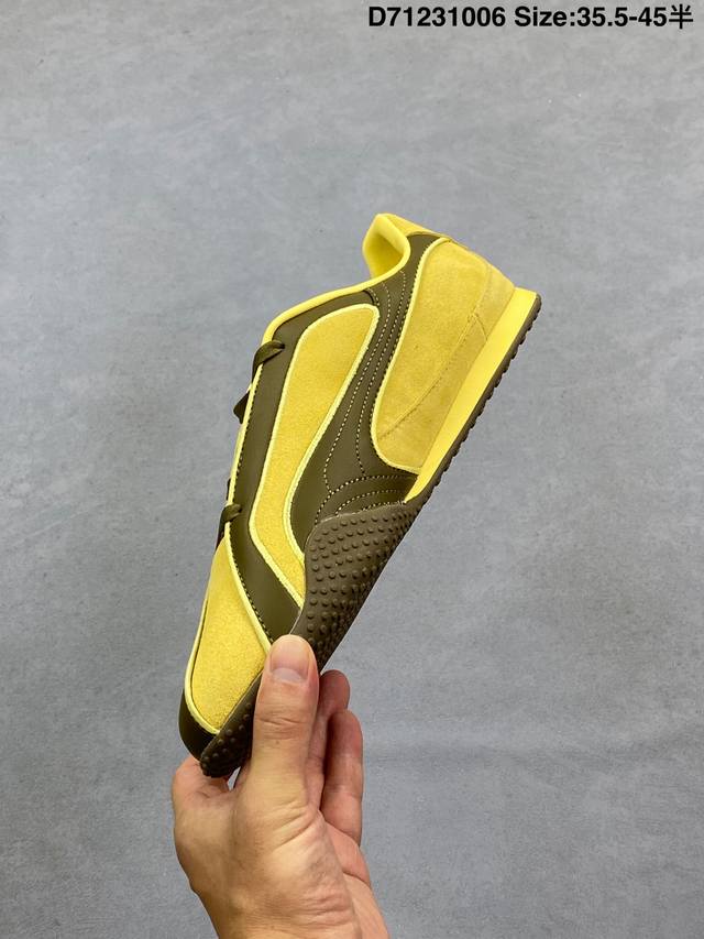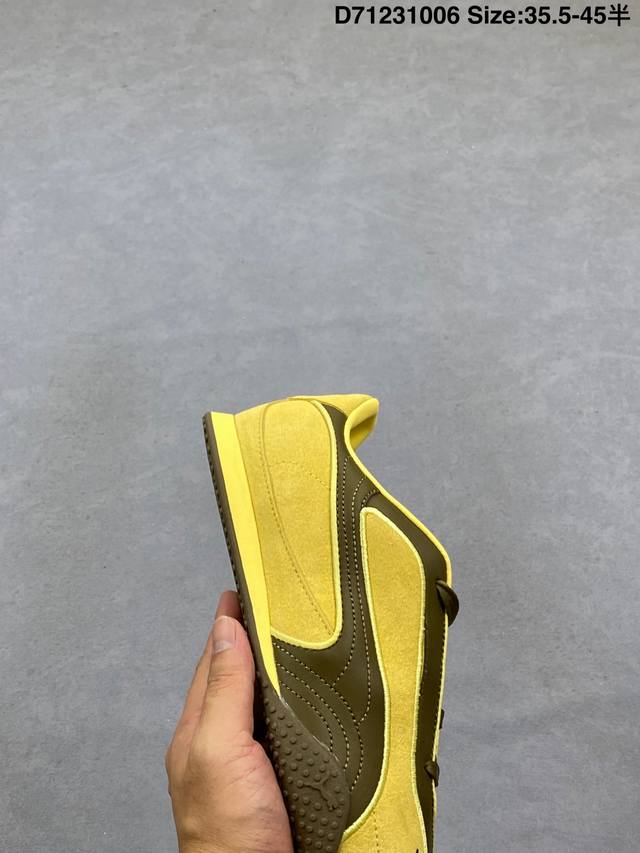 Puma Bella Ut: Stylish, Versatile, Comfortable, Non-Slip Low-Top Casual Shoe with a Thin Sole. Following the return of the Speedcat Og, Puma has once again used the classic Bella Og silhouette from its archives as a base to launch the Bella Ut, a shoe that fits the current trend of thin-soled sneakers. The upper is made of premium leather and continues the Formstrip design language; the toe box features a closed-toe design with suede material for enhanced texture; the sole retains the iconic thin sole and dotted rubber outsole of the Bella model, with an upturned design that wraps around the upper; the tongue and heel are adorned with the cougar logo and the brand's initials, respectively. This shoe features a Softfoam+ insole, balancing aesthetic design with wearing comfort. Available in five colors: white, yellow, blue, silver, and pink.