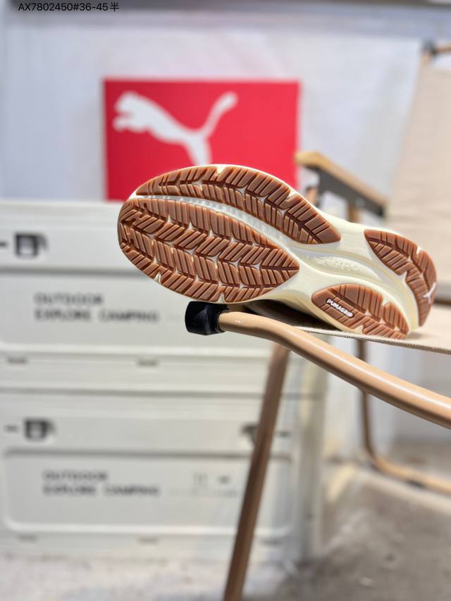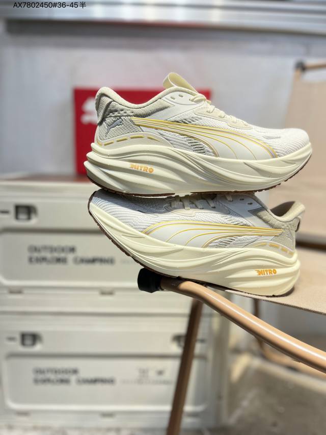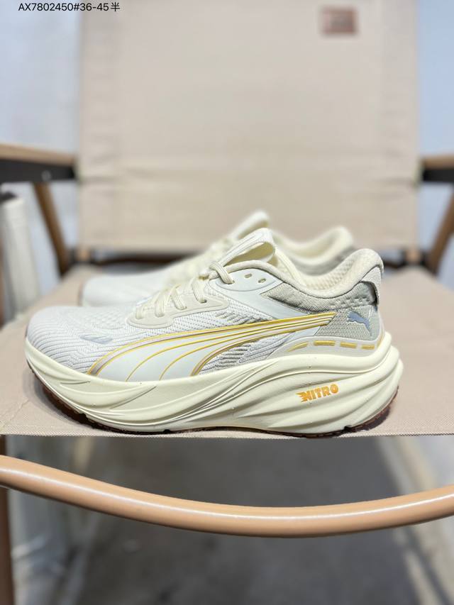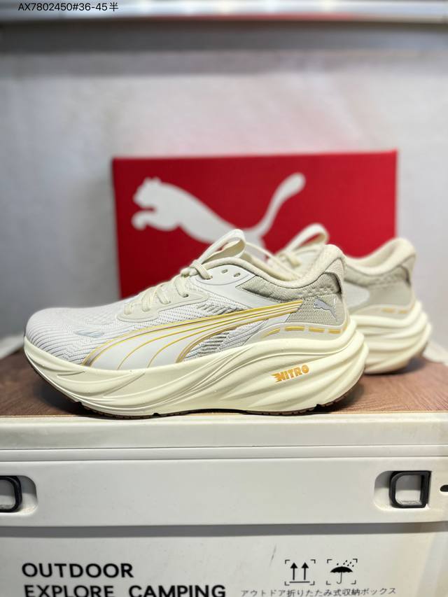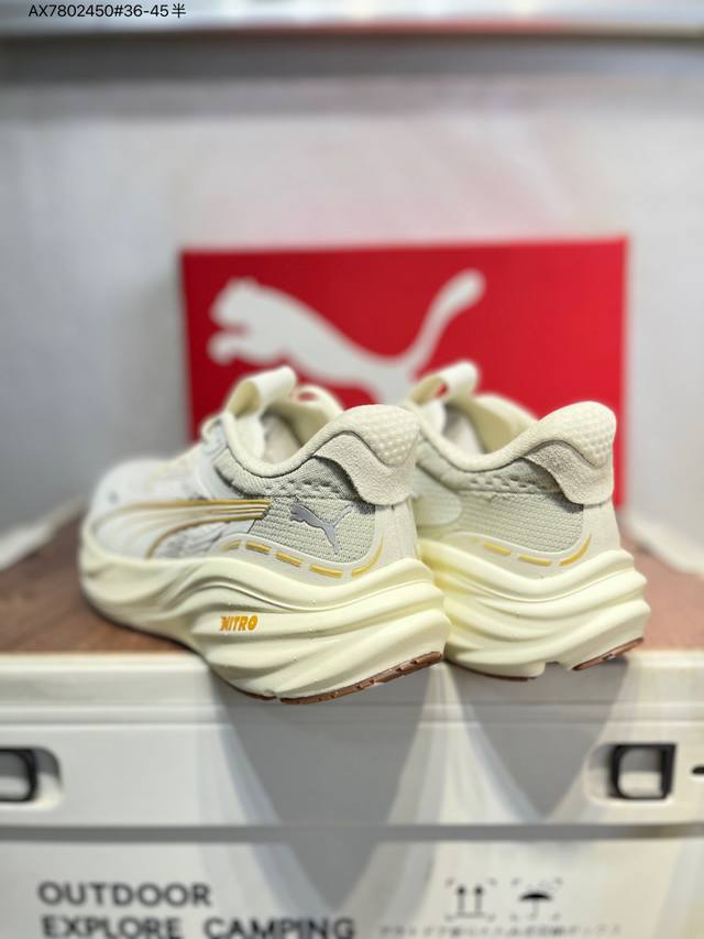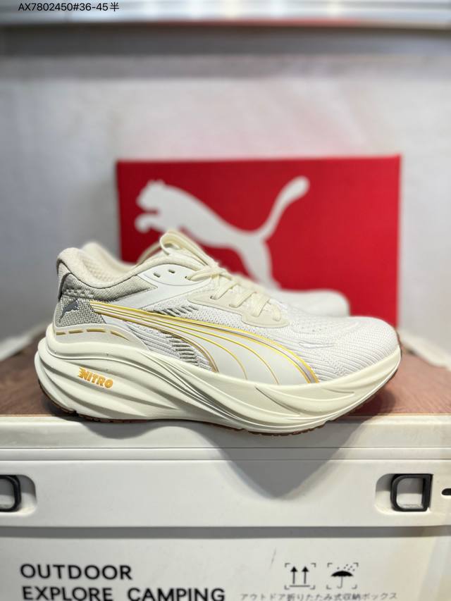 Puma Magnify Nitro 3 running shoes combine functionality and aesthetics for energy storage during runs. Featuring a Puma Nitro midsole, it boasts lightweight and highly cushioned rebound for a soft and comfortable feel. The simple, flowing lines of the Puma running track add a touch of dynamism to the shoe. The upper is made of lightweight, high-elastic fabric, providing breathability, comfort, and a snug fit while ensuring durability and support for rapid running. The supercritical Nitro midsole combined with a thick sole provides comfortable cushioning and energy return, making it suitable for both running and commuting. The Puma streamlined running track on the side is presented in bright colors, highlighting a vibrant athletic aesthetic. The outsole uses Puma Magrip rubber, which is slip-resistant and durable, giving runners a flexible and free running experience. 311046 Ax7802450#36-45 Half DDD