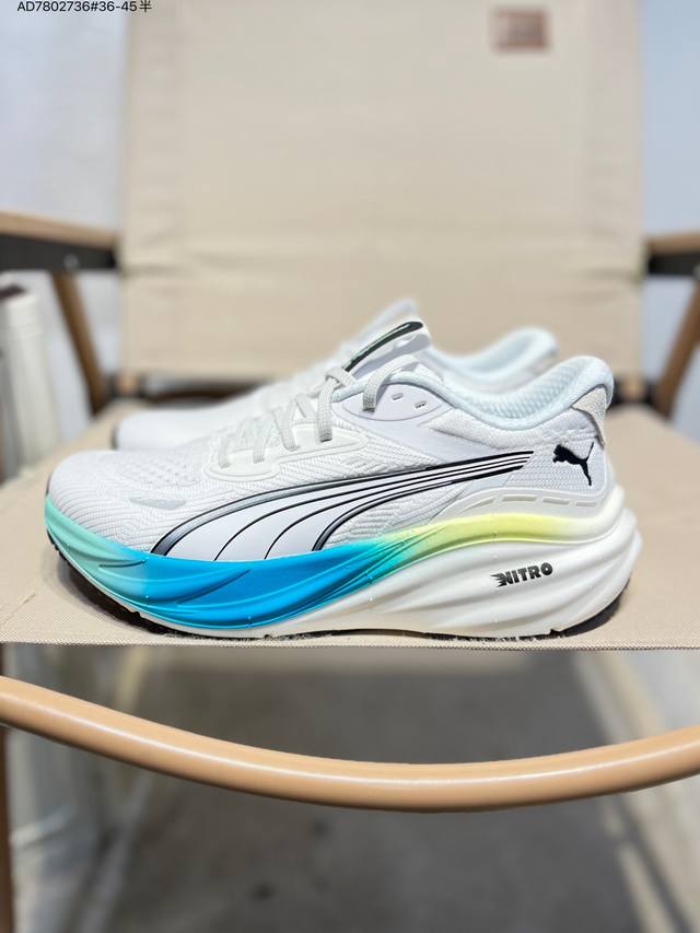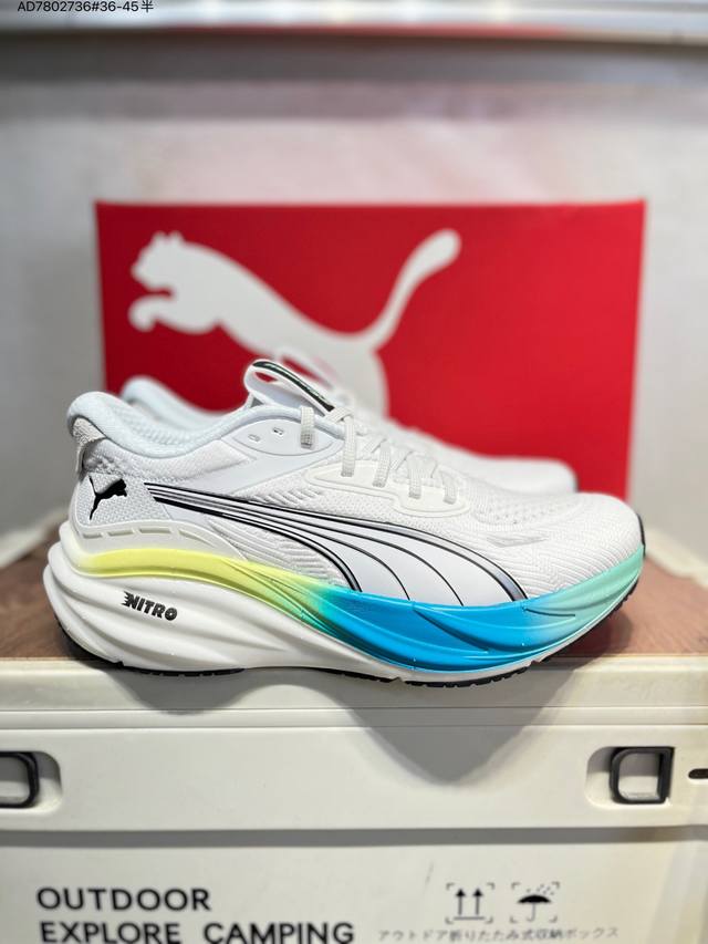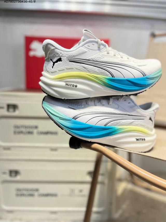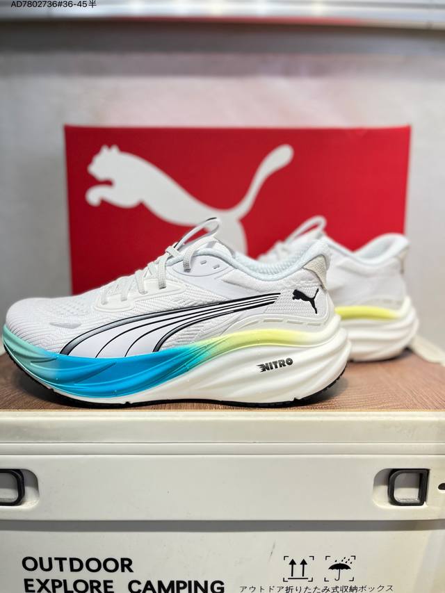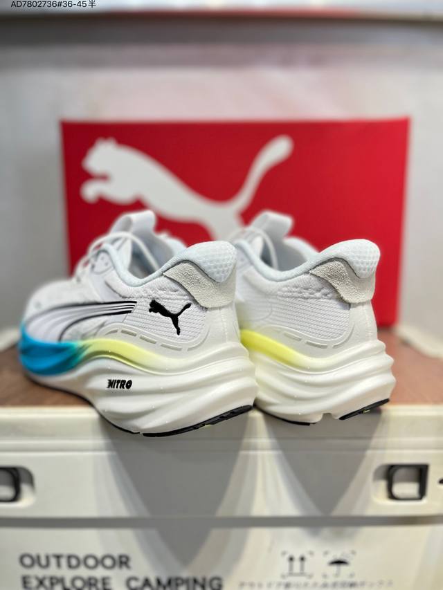 Puma Magnify Nitro 3 running shoes combine functionality and aesthetics for enhanced running performance. Featuring a Puma Nitro midsole, it boasts lightweight yet highly cushioned and responsive cushioning for a soft and comfortable feel. The clean, flowing lines of the Puma running track add a touch of dynamism to the shoe. The upper is made of lightweight, high-elastic fabric, offering breathability, comfort, and a snug fit while ensuring durability and support for rapid sprints. The supercritical Nitro midsole combined with a thick sole provides comfortable cushioning and energy return, making it suitable for both running and commuting. The Puma streamlined running track on the side is presented in bright colors, highlighting a vibrant athletic aesthetic. The outsole uses Puma Magrip rubber, providing slip resistance and durability for a flexible and agile running experience. (Item number 311046 Ad7802736# 36-45 half)