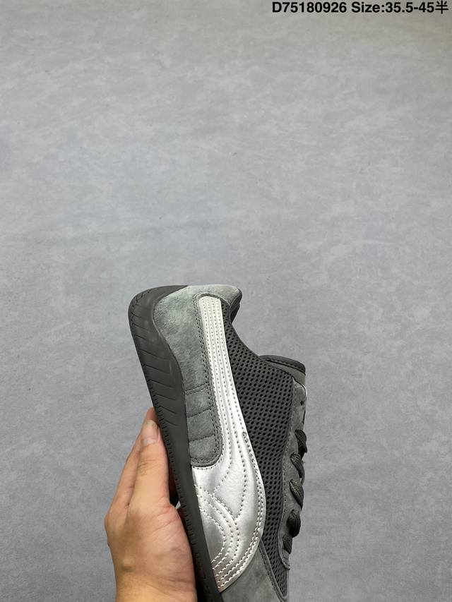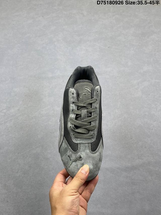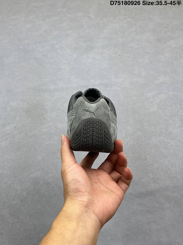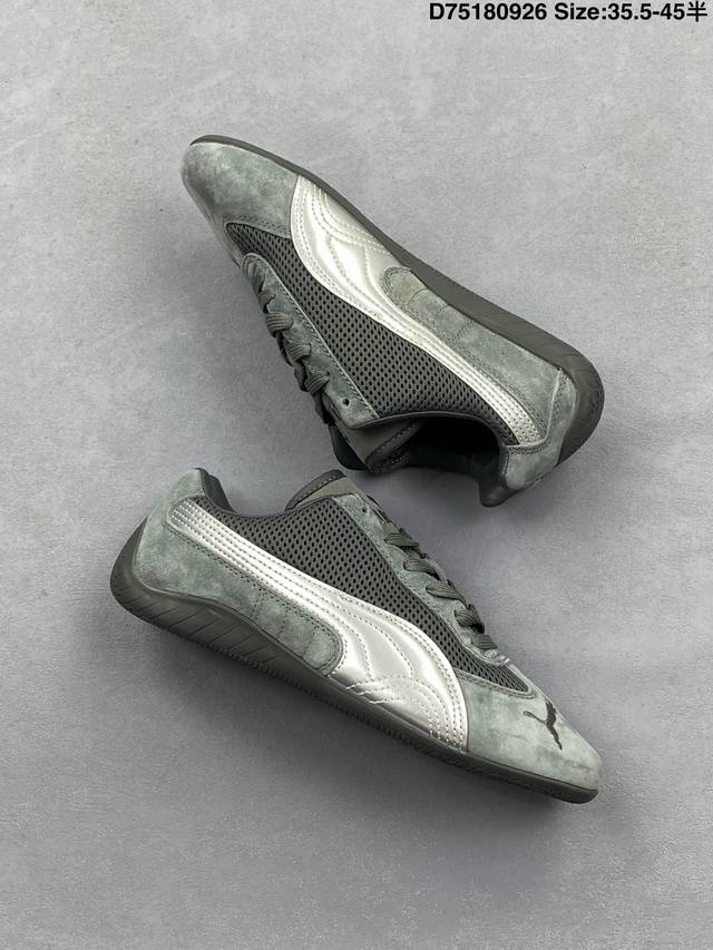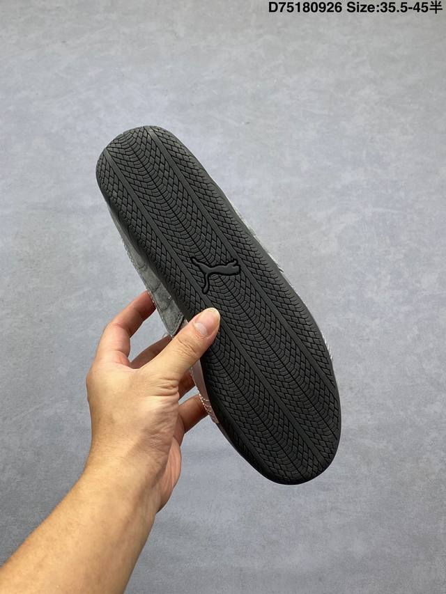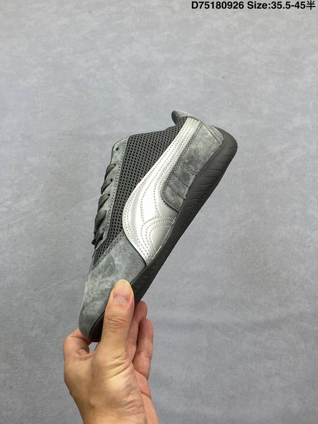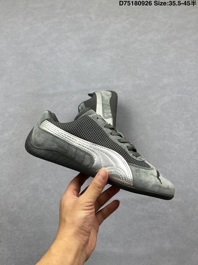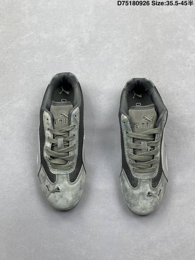 PUMA Roma M Motorsport low-top retro sports and leisure racing shoes. The only correct version on the market. Exclusive platform ordering. Original private mold. Correct cardboard midsole. Sea glass insole. Original box. Available in three sizes. Original electro-embroidered correct suede upper. The globally renowned sports brand PUMA's BMW Racing series incorporates the iconic colors of the BMW team, setting the trend with playful, edgy, retro designs. It blends the spirit of the racetrack with street fashion, embarking on a journey of cutting-edge racing. Since the Bavarian team entered the world stage in 1978, BMW Motorsport has left a lasting mark on the global automotive and motorsport landscape. The two new BMW MMS Roma and BMW MMS Speedboat shoes draw inspiration from BMW models. Featuring a black or white base, they incorporate classic colors, showcasing avant-garde retro style. The Roma shoe features a retro, streamlined design on the side, adorned with the classic BMW logo, creating a striking and eye-catching look. The Speedcat shoe, on the other hand, features a comfortable upper with striking tri-color stripes, giving it a unique aesthetic and evoking the endless energy of racing.