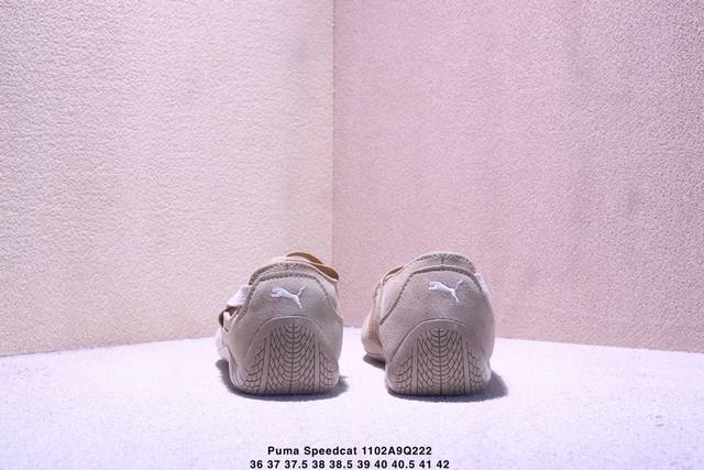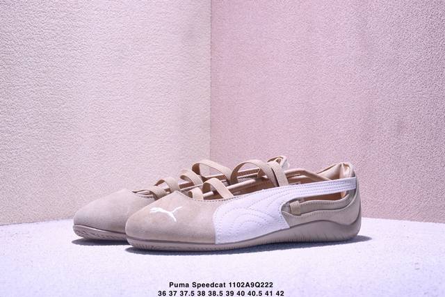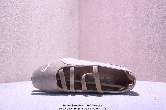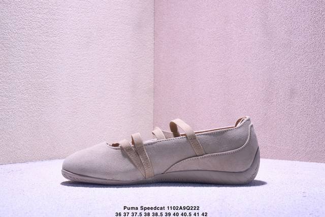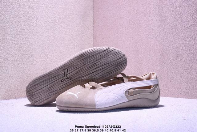 Puma Speedcat Ballet Mary Jane Shoes Women's Sports Casual Shoes Puma Women's Speedcat Ls Park Chae-young's Same Style Racing Shoes Suede Casual Shoes. Puma launches the new Speedcat Ballet shoe, fusing the classic Mary Jane silhouette with the iconic Speedcat thin-soled design, continuing to lead a new chapter in the thin-soled shoe trend. The Puma Speedcat Ballet shoe is based on the Mary Jane shoe, featuring an open forefoot design with elastic buckles. Its smooth silhouette is inspired by ballet flats, elegant yet dynamic. The initial two colorways include white and silver, with the silver version cleverly incorporating metallic elements from F1 racing cars, presenting a unique mixed-style look. Sizes: 36-42 (including half sizes) Xm1102Q222