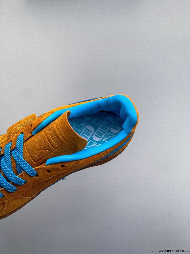 This reissue perfectly recreates the classic design while infusing it with modern elements. The gold-stamped Puma logo on the upper echoes the puma logo on the heel, showcasing the brand's iconic style. The classic blue and white colorway evokes a sense of the passion and energy of the 1980s football field.