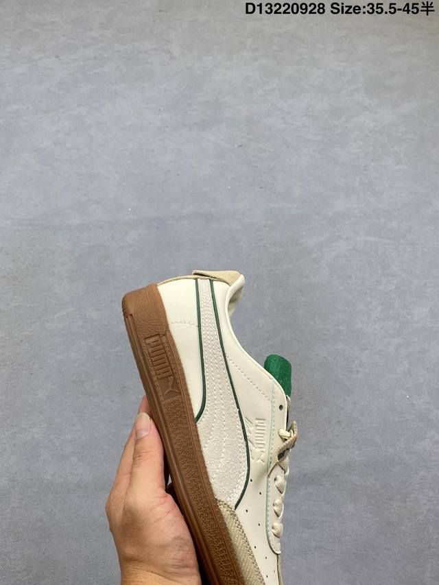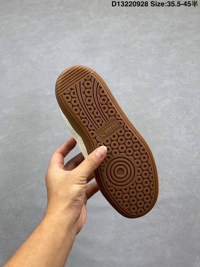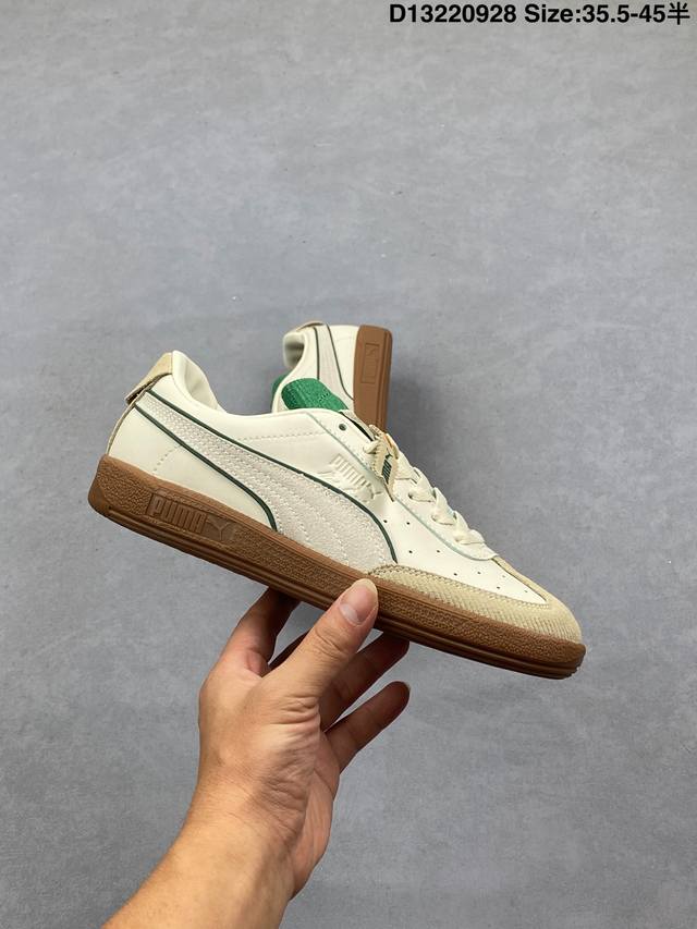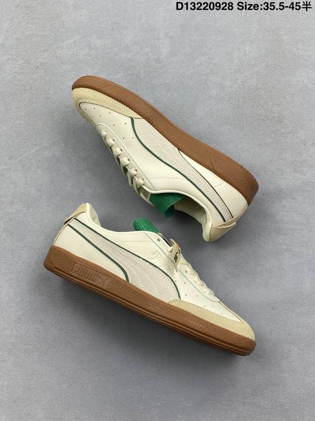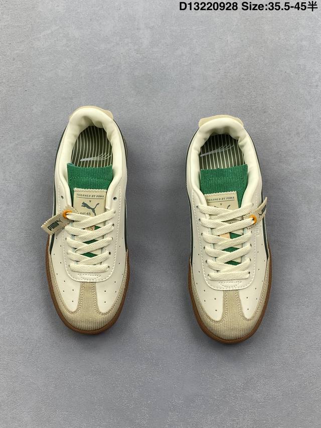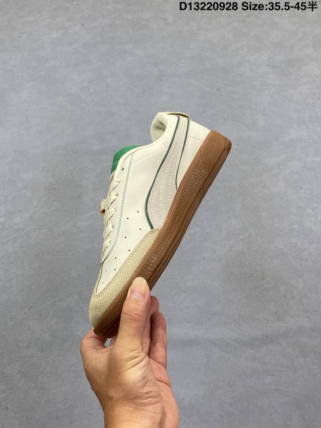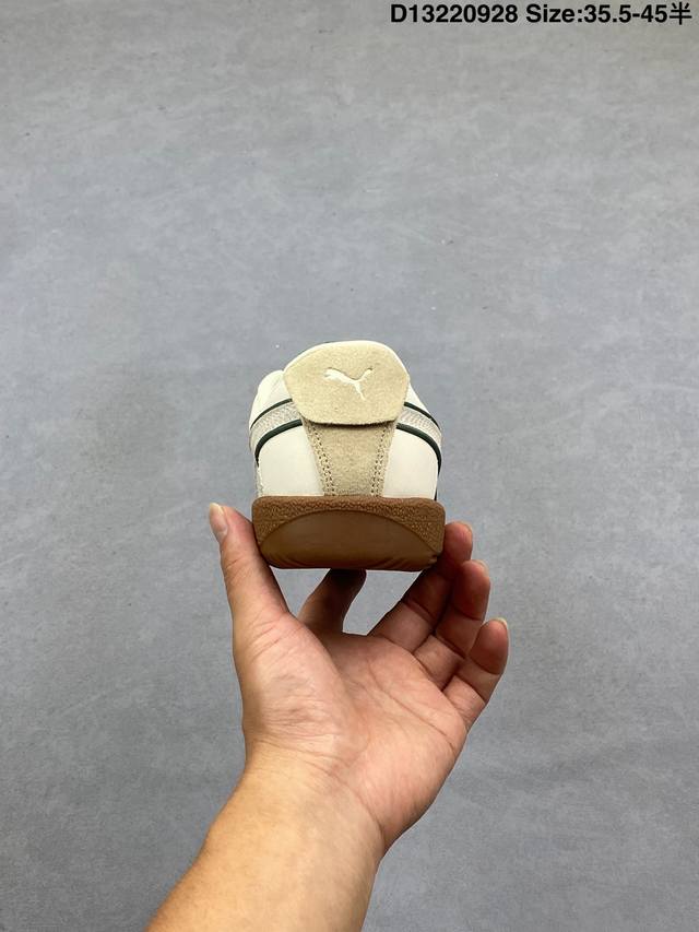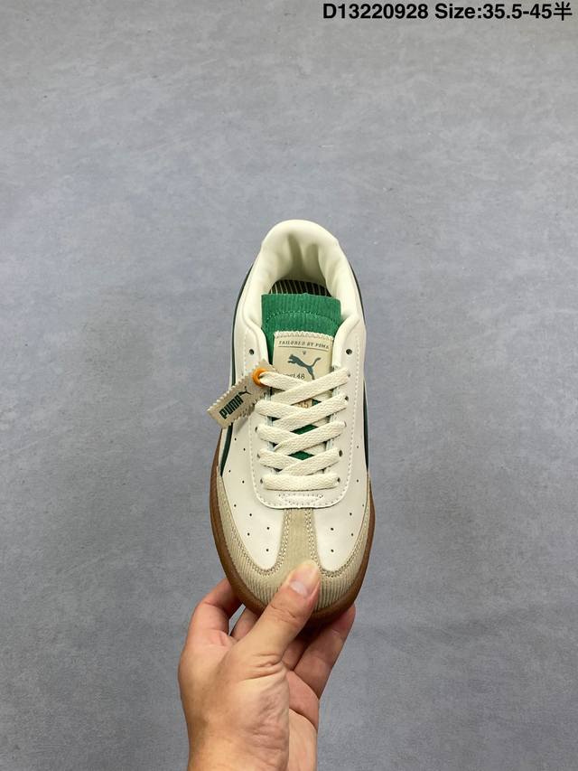 The Puma Army Trainer V2 series is based on the classic Army Trainer. Featuring a predominantly black design with white accents, the shoe offers a classic look that works well in any season. The leather and suede upper ensures a premium feel and a layered look. The T-shaped Army Trainer design with a covered toe cap adds a touch of personality. The side of the shoe features the signature white Puma running track and gold-stamped panther graphic, highlighting the shoe's identity and adding a touch of luxury. The outsole features the Army Trainer's signature rubber outsole, featuring a variety of textures for excellent traction and exceptional comfort. 386607