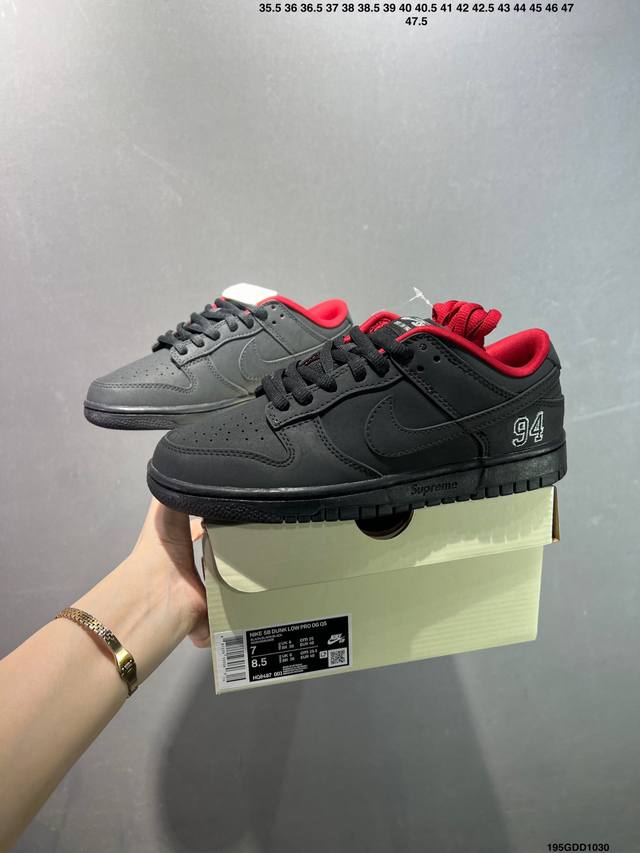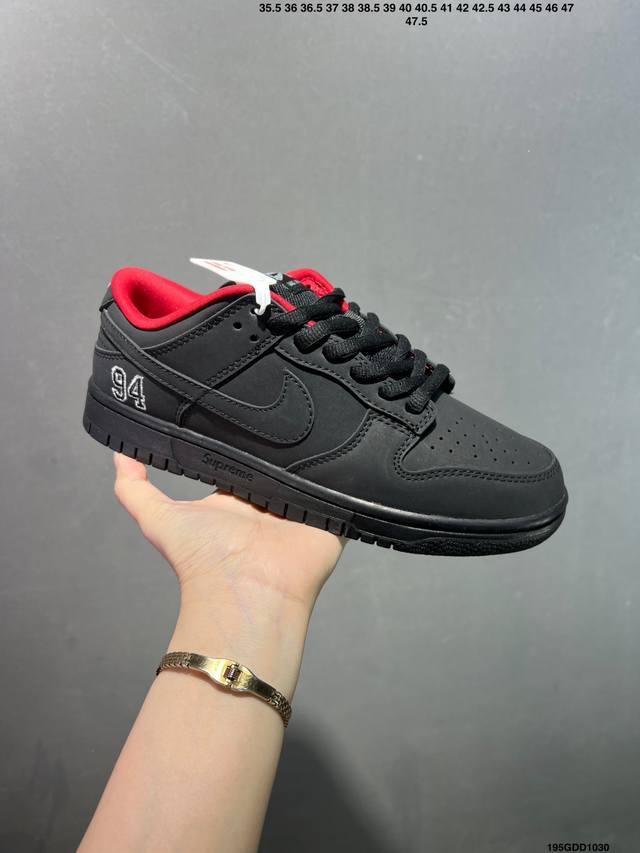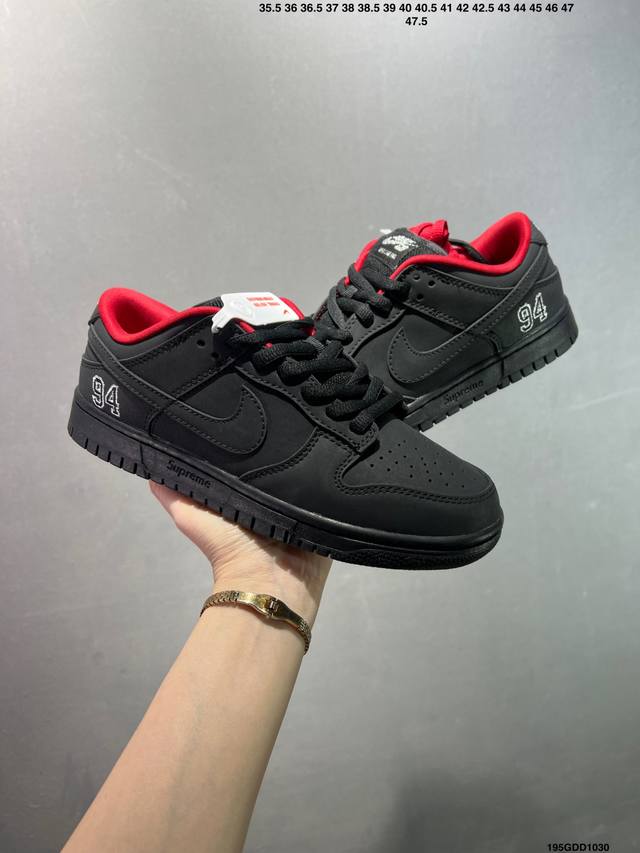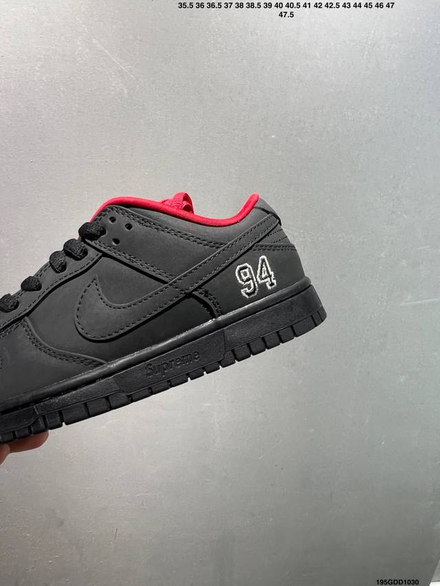 ) This shoe features an embroidered "94" on the heel, commemorating the brand's founding year. The brand's iconic logo is also etched onto the sidewall of the midsole. The insoles retain the standard red surface, with the Nike SB logo on each insole, and the Supreme logo spanning both insoles. Style Code: Hq8487-001 Sizes: 40, 40.5, 41, 42, 42.5, 43, 44, 44.5, 45 ID: 195Gdd1030